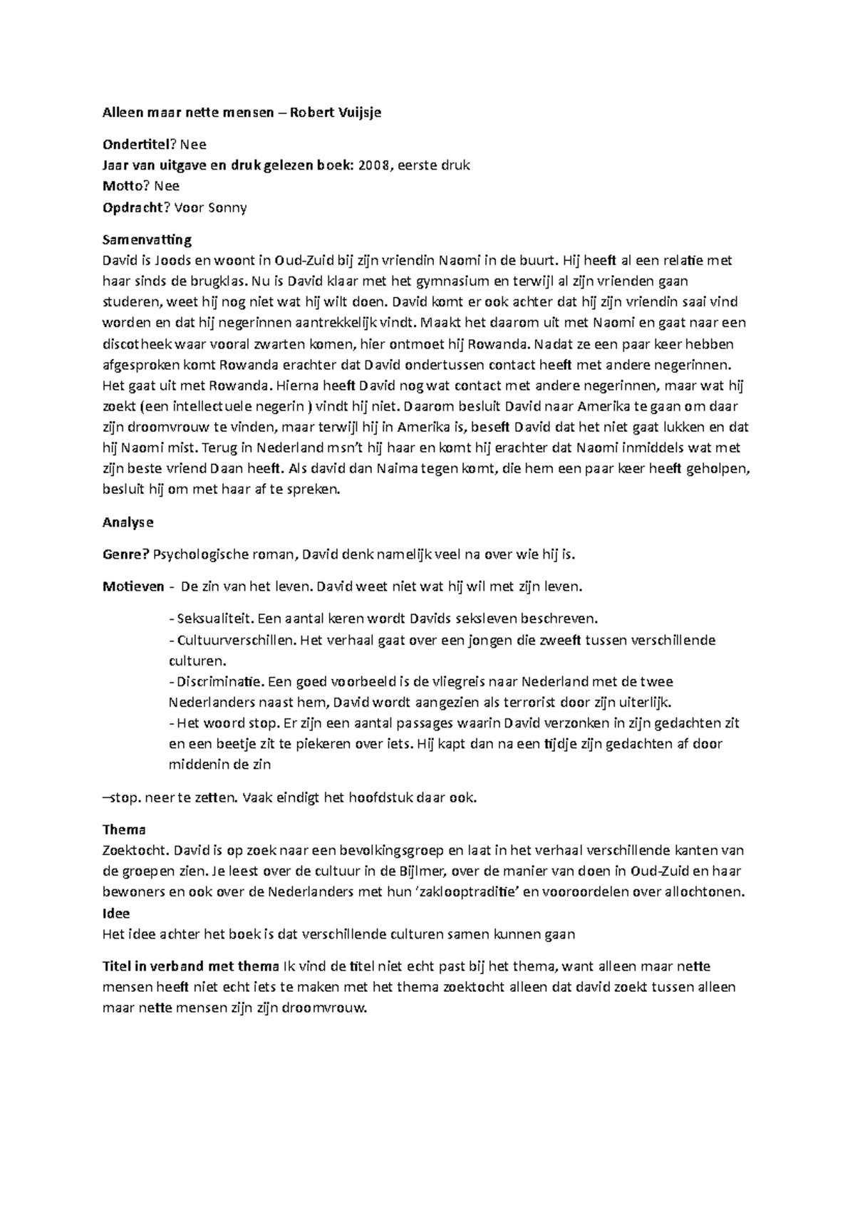 Alleen maar nette mensen. Boekverslag Alleen maar Nette mensen Gebruikt in Havo 5 Bevat: Samenvatting, Hoofdpersoon incl. 3 karaktereigenschappen van David, Tijd, Ruimtes, Auteur, Vertelsituatie, Thema, Motieven, Verwerkingsopdracht; gedichten en de Recensieopdracht. Voorbeeld 3 van de 19 pagina's. Meld schending auteursrecht.