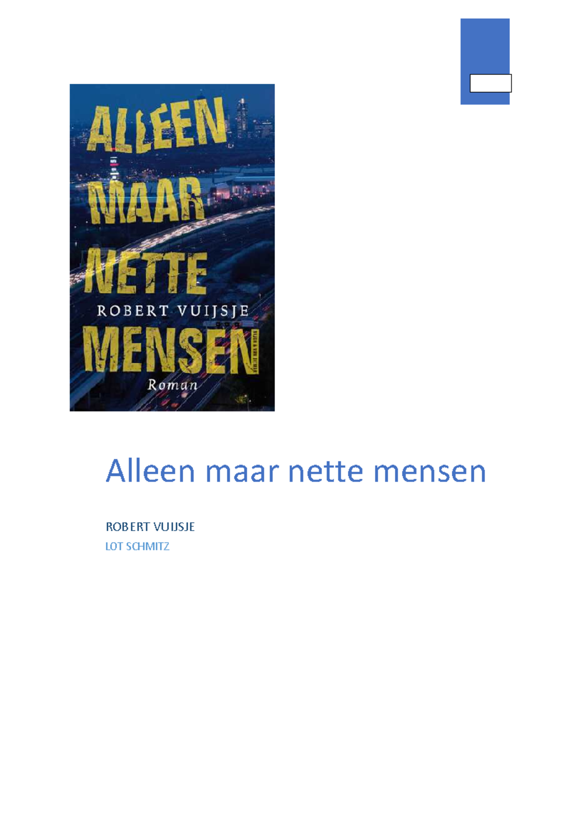 Boekverslag. Liv ten Thije 5v. Titel en Samenvatting. Titel: Alleen maar nette mensen. Schrijver: Robert Vuijsje. Uitgave: 2008. Alleen maar nette mensen gaat over David, een Joodse jongen van het Gymnasium die midden in de kakkerswijken van Amsterdam Oud-Zuid woont.