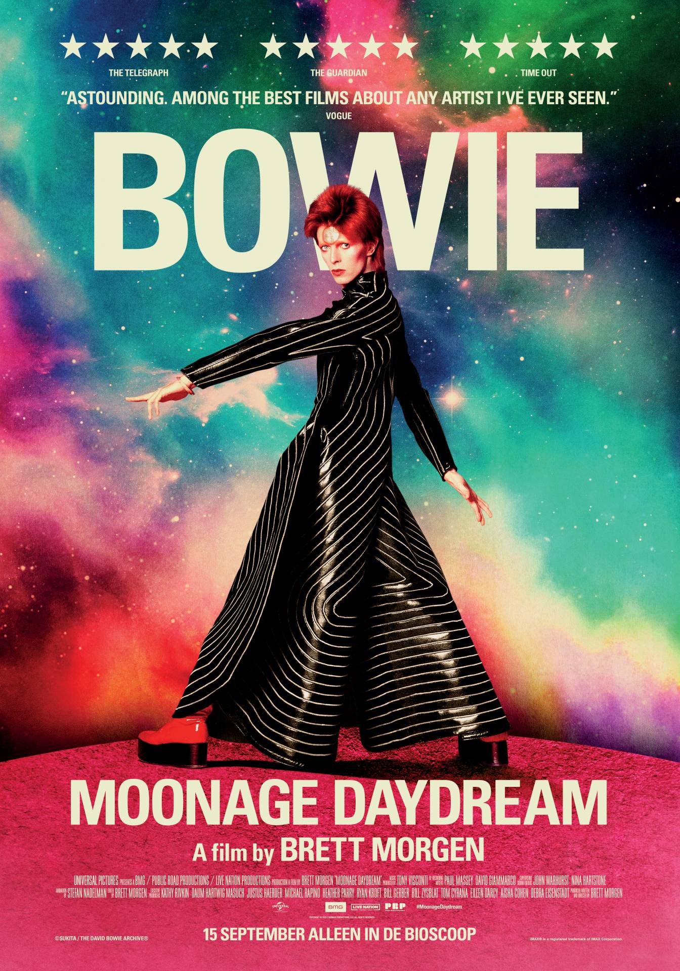 Moonage Daydream. Duitsland/ Verenigde Staten 2022. Documentaire van Brett Morgen. Experimentele non-fictiefilm over het popgenie David Bowie. Regisseur Brett Morgen kreeg van de erven Bowie toegang tot iets van vijf miljoen stukken archiefmateriaal en verwerkte dat in vijf jaar tijd tot dit caleidoscopische, half-psychedelische en zeer.