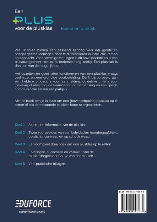 Een plus voor de plusklas. Jan Kuipers, Bouke van der Meulen | 9789083290379 | Eduforce | Editie: 1. € 39,95. 5% korting voor studenten* Wordt binnen 2 werkdagen geleverd. In winkelwagen. Omschrijving. Het opzetten en goed laten functioneren van een plusklas vraagt veel inzet en een grondige voorbereiding. Denk aan een heldere procedure voor.