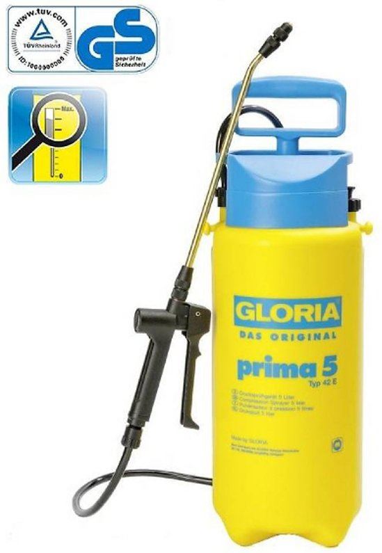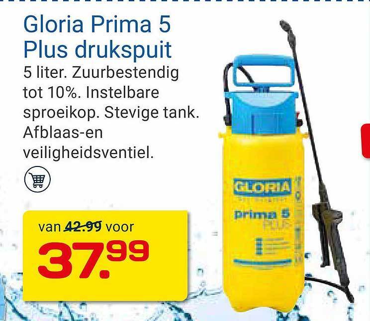 Productbeschrijving. Gloria Drukspuit Prima 5 Plus is in het bijzonder geschikt voor onkruidbestrijdingsmiddelen op zuurbasis, die tegenwoordig steeds meer gebruikt worden. De Prima 5 Plus kan ook tegen schoonmaakazijn, iets waar andere drukspuiten vaak niet tegen bestand zijn. De Plus wel, doordat deze EPDM afdichtingen, een gewapende slang en.