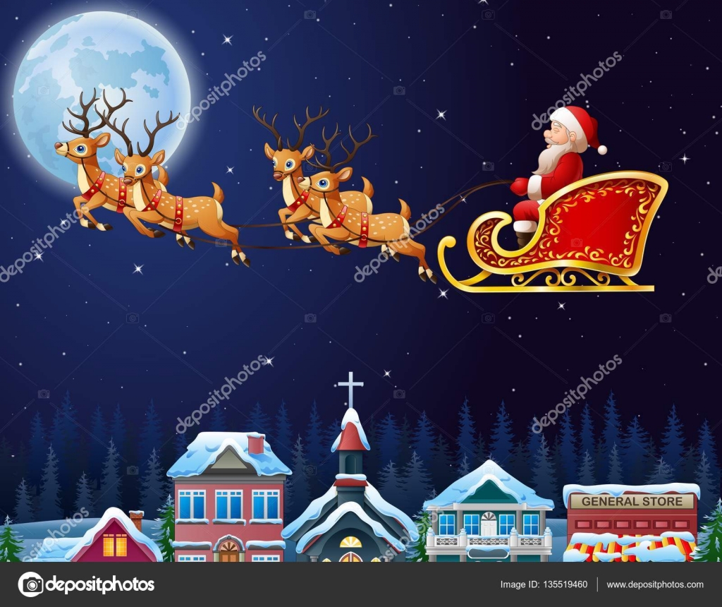 Kerstman zijn slee van de rendieren vliegen over stad rijden vectorafbeelding door