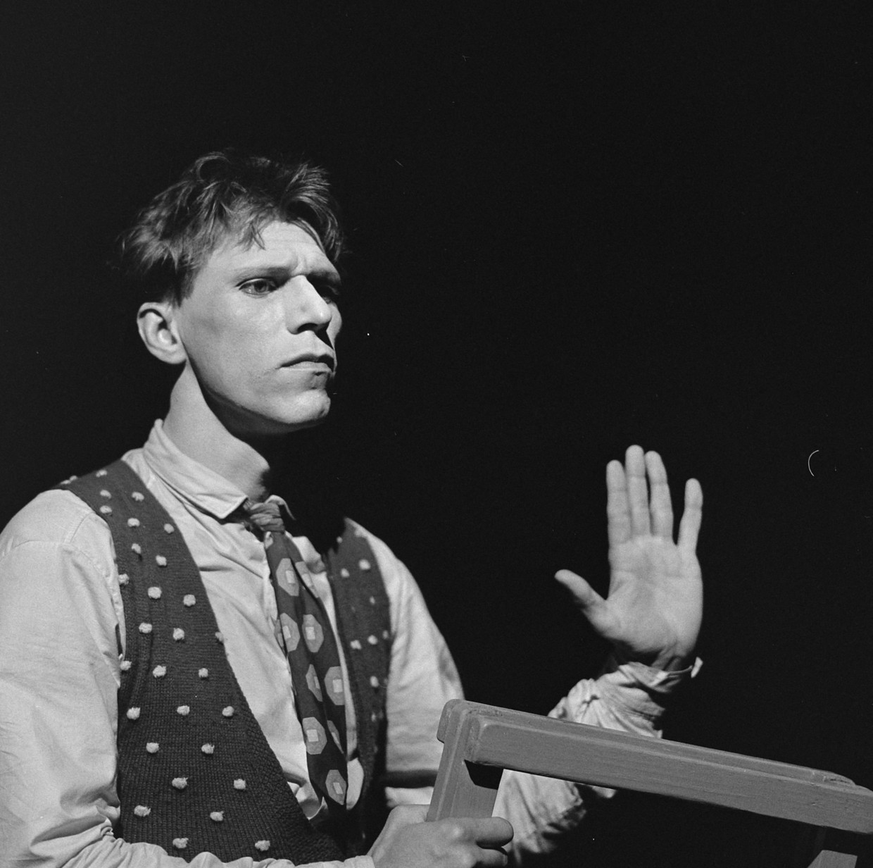 Jim van der Woude was een markante theaterpersoonlijkheid, bekend om zijn fysieke, absurdistische spel. Hij floreerde als de zaal om hem lachte, maar hij was ook onzeker.. Acteur Jim van der.
