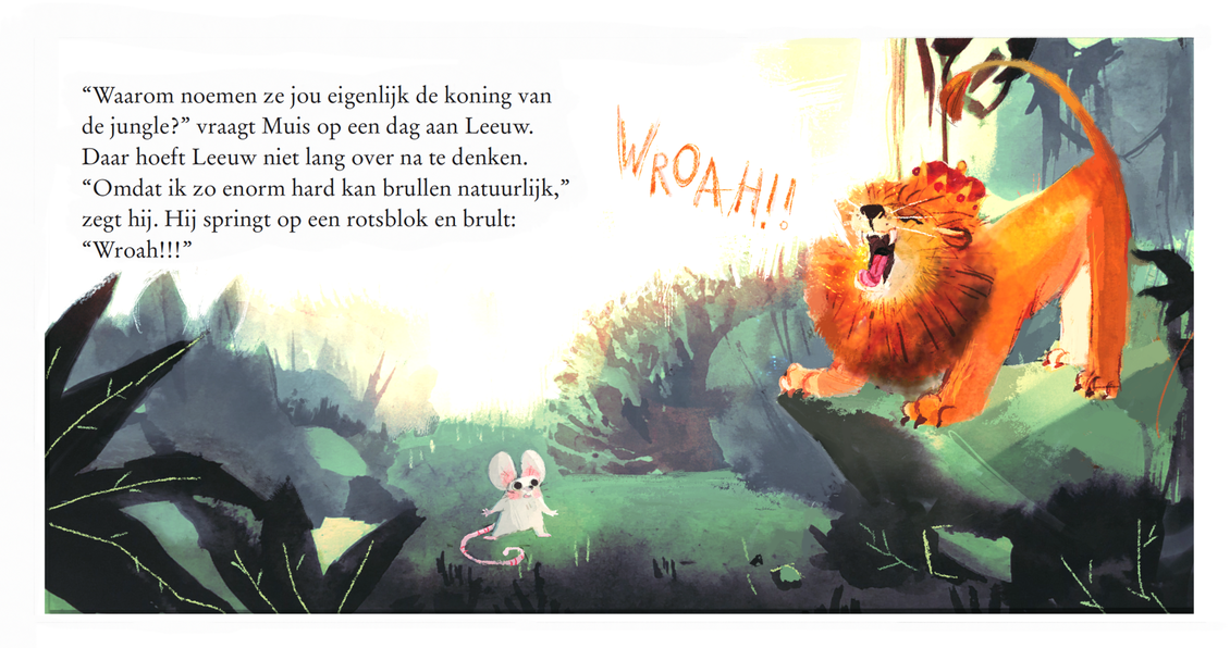 Muis wil graag weten waarom Leeuw de koning van de jungle is. Leeuw geeft allerlei redenen, maar steeds wordt hij door een ander dier verslagen. Maar waarom is hij dan toch de koning van de jungle? Vierkant prentenboek met dynamische kleurrijke illustraties. Vanaf ca. 4 jaar.