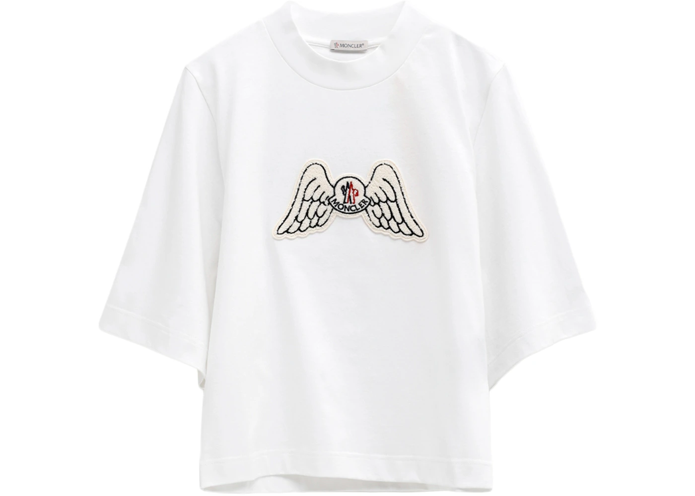 Product Description. Moncler and Palm Angels released this Moncler x Palm Angels Mock Neck Wings T-shirt in white as a part of the pair's December 2021 collaboration. This t-shirt features a boxy fit and a collaborative Moncler x Palm Angels wings patch. In terms of materials, the t-shirt is made from a 100% cotton material.