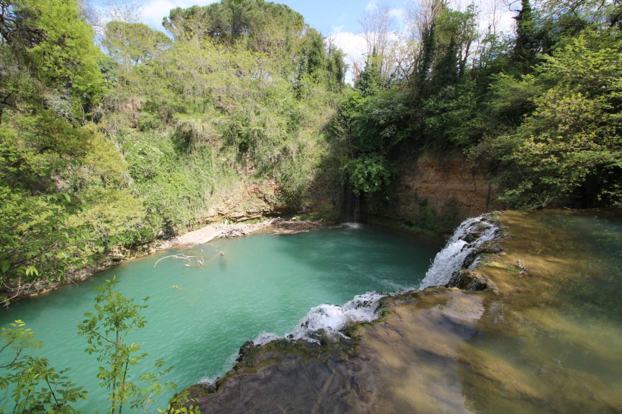 Cascata del Diborrato is a popular waterfall in the Parco Fluviale dell Alta Val d'Elsa (protected since 1997) below the town of Colle di Val d'Elsa, which is between the well-visited Siena and San Gimignano. While the waterfall's name suggests that there's only one waterfall or cascata, there are actually several of them of varying.