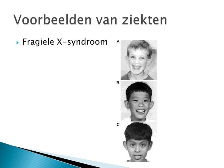 Over het fragiel X syndroom. Jongens vertonen het klassieke beeld van matige verstandelijke beperking en typisch gedragspatroon. Bij meisjes is het syndroom minder uitgesproken en meer variabel. Aangezien het gaat om een geslachtsgebonden vorm van overerving is verder familie onderzoek onder de vorm van dragerschap onderzoek aangewezen.